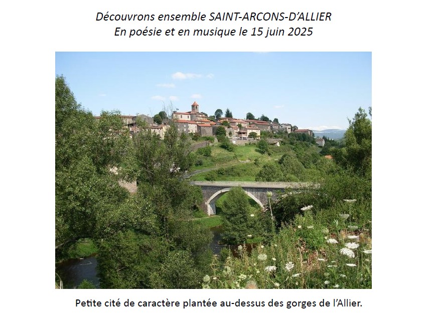 La balade poétique organisée le dimanche 15 juin 2025 à Saint-Arcons d’Allier par le Cercle Amélie Murat fut un projet lancé par une native de la vallée Anne Marie Pralong Valour , une amoureuse du Haut Allier dont la maison anciennement Le Relais des pécheurs du village domine la rivière et le pont vert qui l’enjambe.
