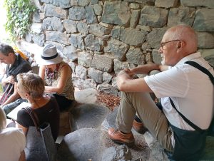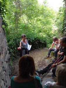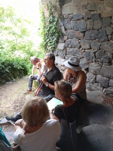 Et le15 juin, après une présentation historique et géographique, ils partirent avec un groupe de visiteurs et d’amateurs de poésie vagabonder par les rues étroites et fleuries du village, à la découverte de sa calade, de son église qui résonna aussi d’ un bel Ave Maria, de son saint martyr, de son cimetière, de sa vierge …. De ses points de vue magnifiques sur les orgues basaltiques et la rivière au creux de la vallée mais aussi de ses souvenirs le plus tragiques .. Puisqu’ un terrible assassinat y eut lieu au XIXème qui nous fut relaté avec une vraie intrigue policière et poétique( !)